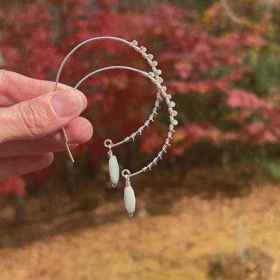 These sterling silver hoops are a blend of color and craftsmanship — adorned with faceted aquamarine, deep lapis, warm garnet, and soft hints of pastel stones for a subtle, elegant mix of color. A larger faceted aquamarine oval dangles gracefully from each hoop, catching the light with every move.