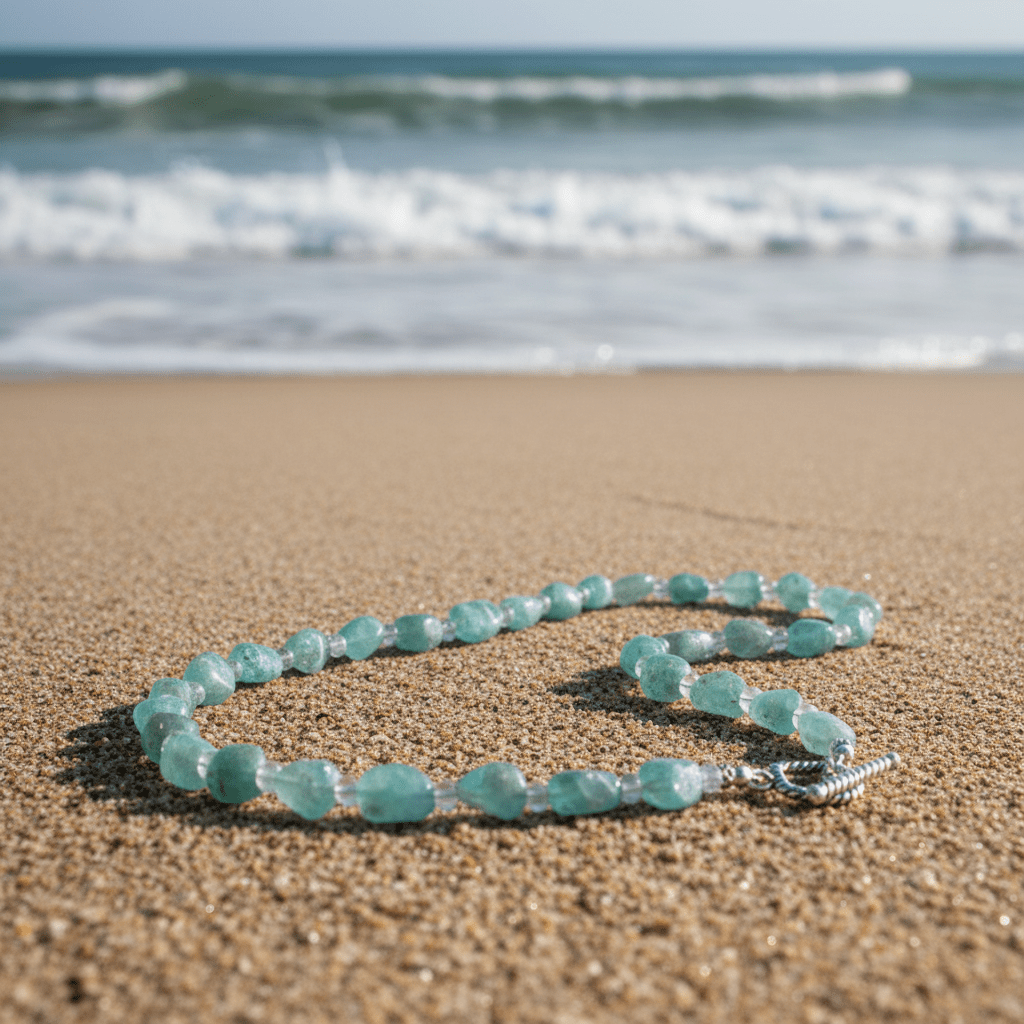 Soft ocean blues meet effortless elegance in this one-of-a-kind, handmade necklace. A tumbled apatite nugget takes center stage, framed by delicate faceted aquamarine rondel spacers that catch the light with every movement. Finished with a sterling silver toggle clasp for easy on-and-off wear—no struggling with tiny clasps.