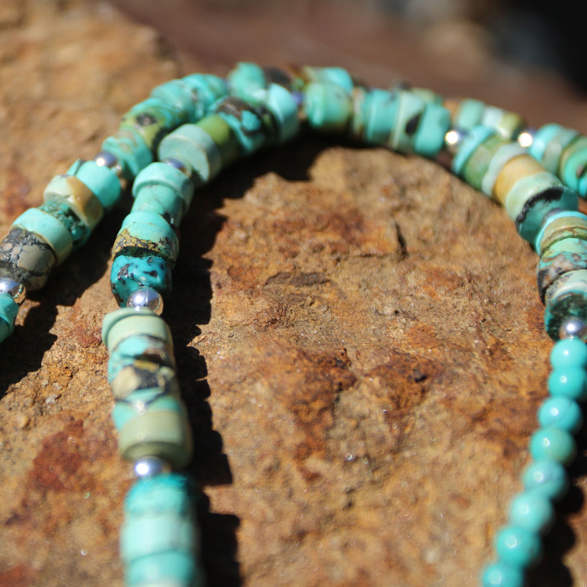 The turquoise heishi beads are rich and earthy, showcasing natural variations in blue-green tones with occasional matrix that gives each strand personality. Their hand-cut, slightly irregular shape adds texture and authenticity, while the polished surface keeps the look smooth and wearable.