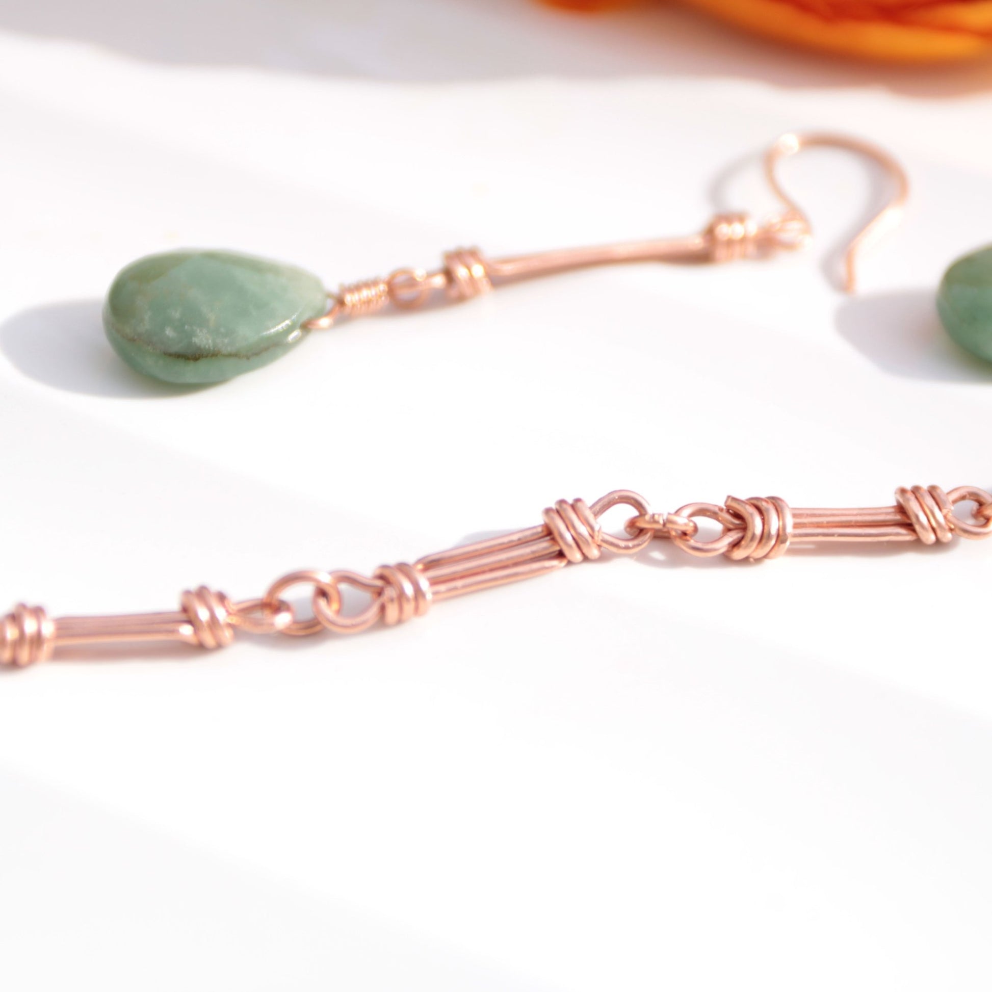 These handcrafted copper earrings blend earthy warmth with a touch of natural elegance. Each earring features a slender bar link design—strong yet graceful—and a shimmering green faceted aventurine briolette that catches the light beautifully.
