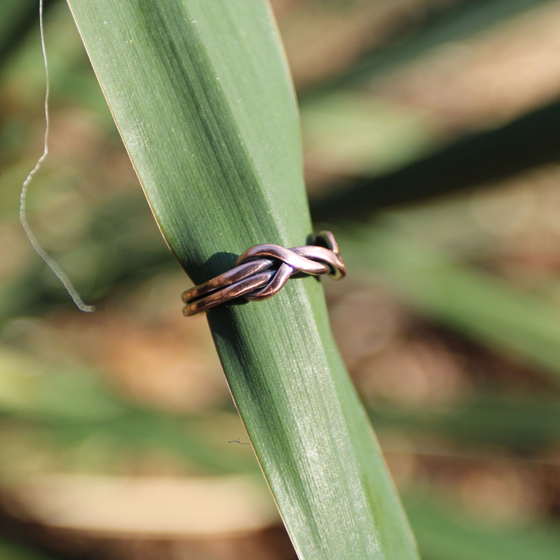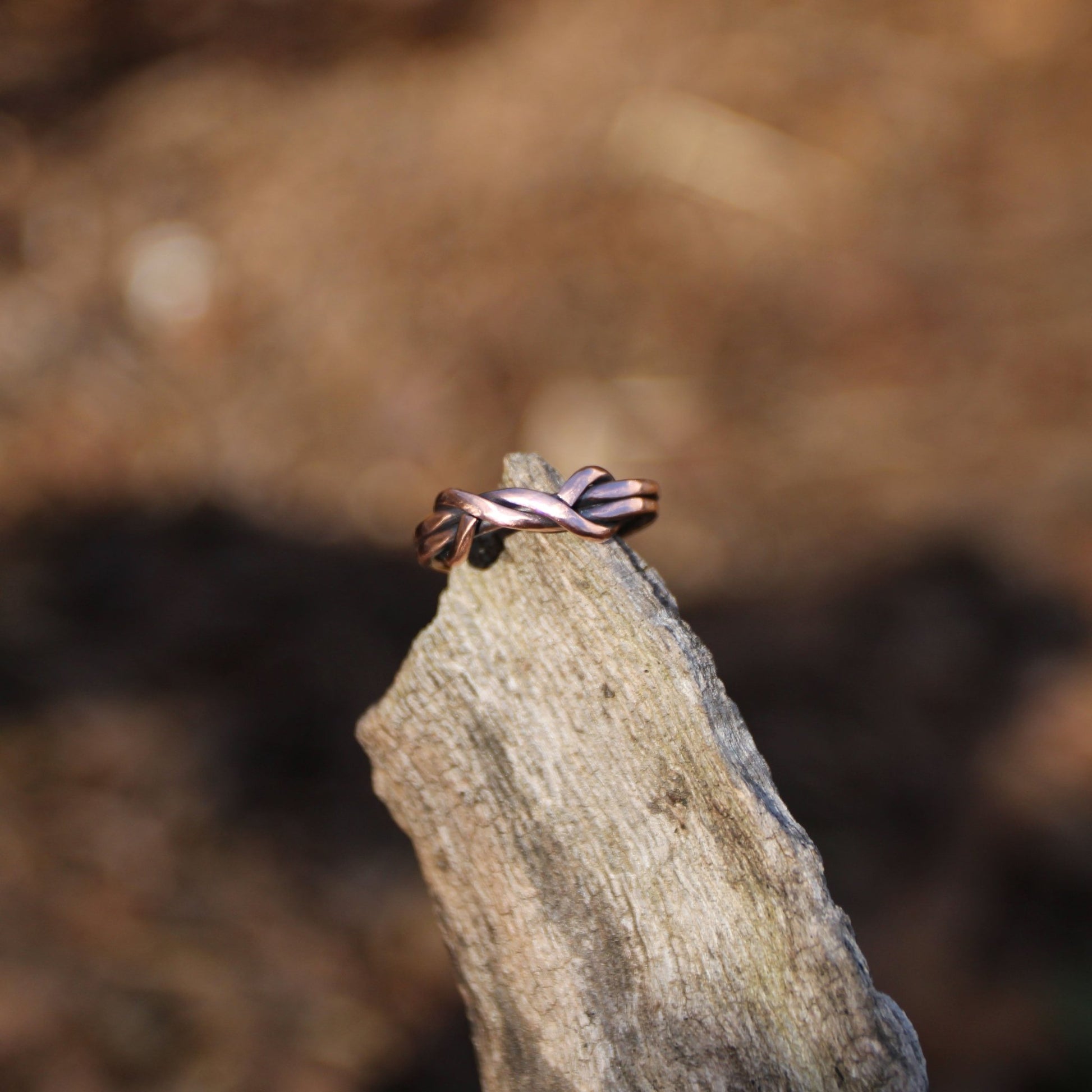The men’s ring is made with sturdy 14-gauge bare copper wire, while the women’s ring uses slightly lighter 16-gauge copper wire. Both have a comfortable, durable feel and show the natural warmth that makes handmade copper jewelry so unique.