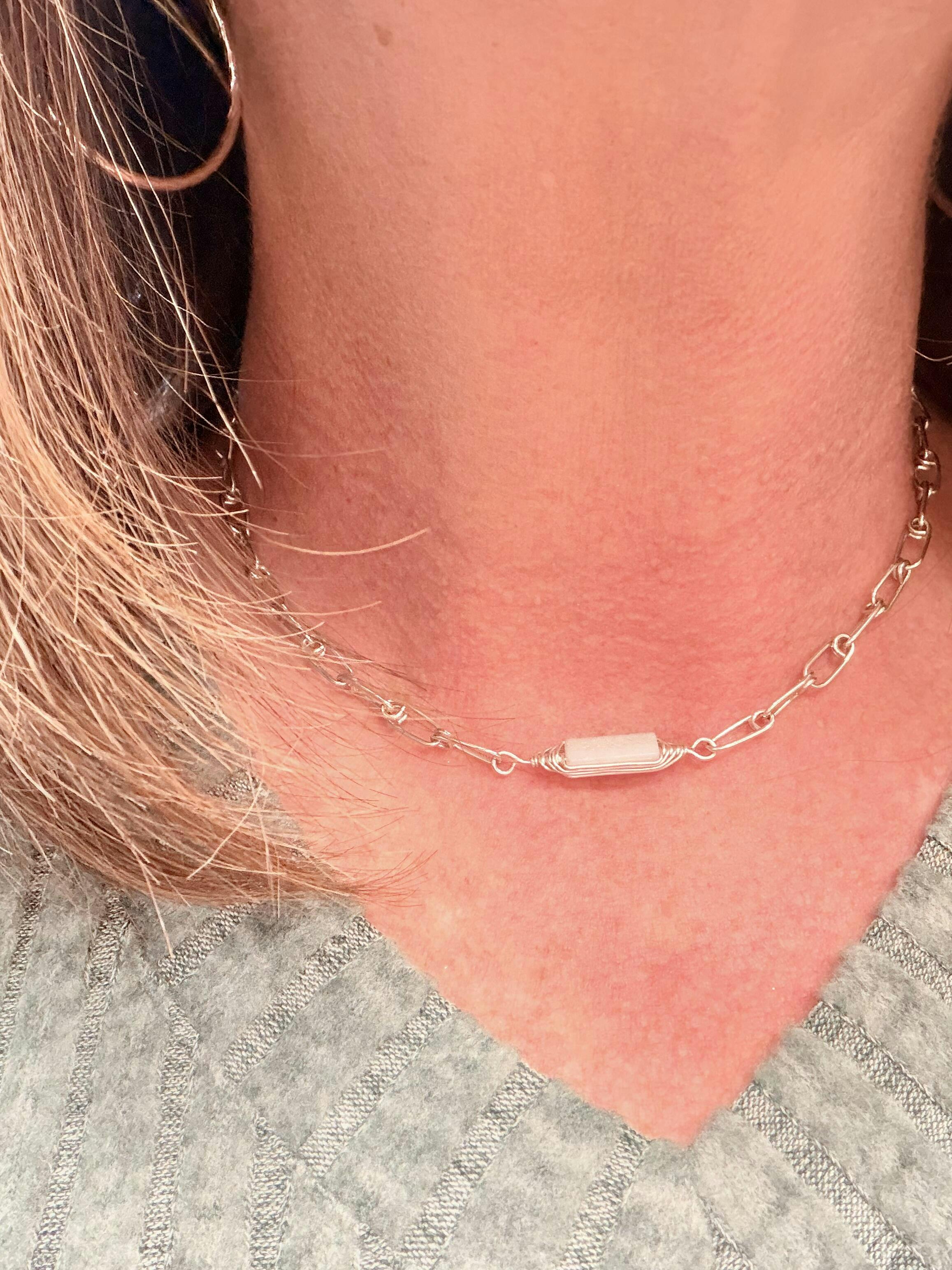Upgrade your artisanal jewelry game with our Sterling Silver Paper-clip Chain Necklace. There's just something about a piece that is handmade, with care, with precision. This popular item is handcrafted with a herringbone weave and a stunning amazonite stone as the focal, and is perfect for layering. Stay on trend and add a unique touch to your collection
