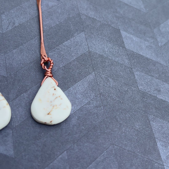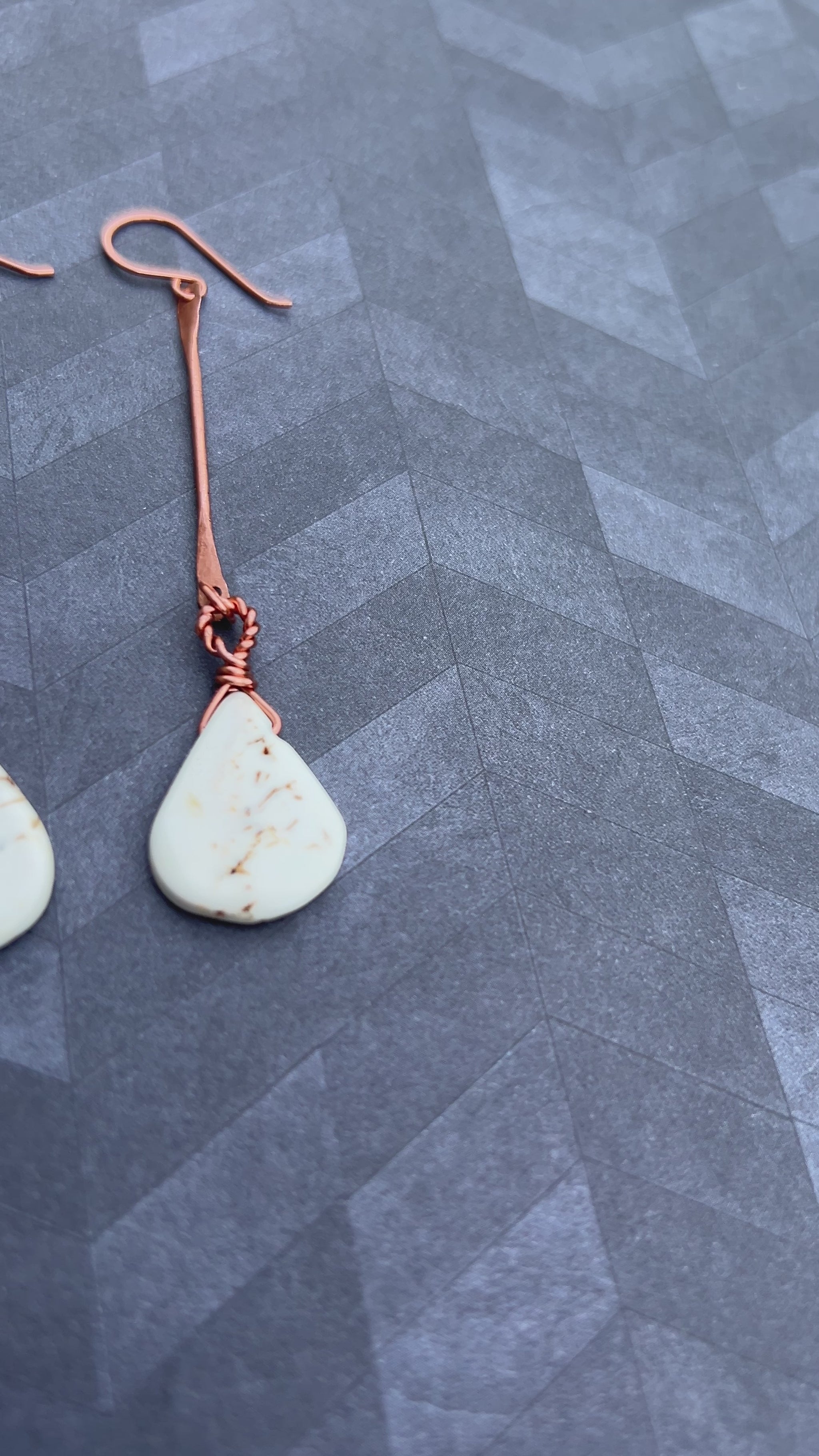 Transform your outfit with these elegant White Turquoise Copper Earrings. Adorned with a beautiful white turquoise briollete stone, the unique bar link with hammered texture makes these earrings one-of-a-kind. Handcrafted French ear wires ensure a secure and comfortable wear. Elevate your style with these refined earrings.